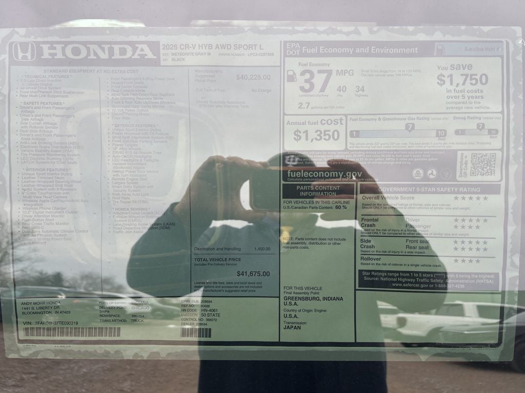 You consent to receive autodialed, pre-recorded and artificial voice telemarketing and sales calls, text messages and/or emails from or on behalf of Andy Mohr at the phone number and/or email provided in this application, including cell phone numbers. You understand that this consent is not a condition of purchase of a vehicle or any services from Andy Mohr. Get MOHR for your money at the ALL NEW Andy Mohr Honda in Bloomington! Call us today at 812-336-6865. MPG Disclaimer: *Based on 2022 EPA mileage and driving range ratings. Use for comparison purposes only. This vehicle may have optional Theft Deterrent at $299 and Ziebart at $799 added to vehicle.