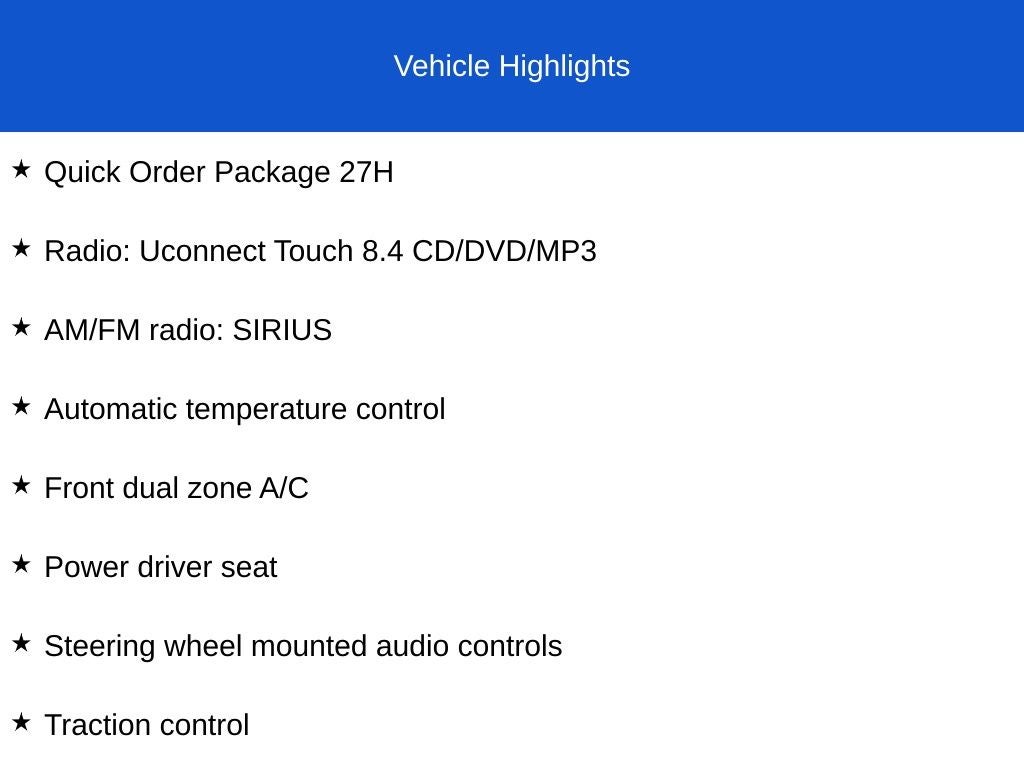 - UConnect Touch 8.4 -inc: AM/FM stereo w/CD/DVD/MP3 player