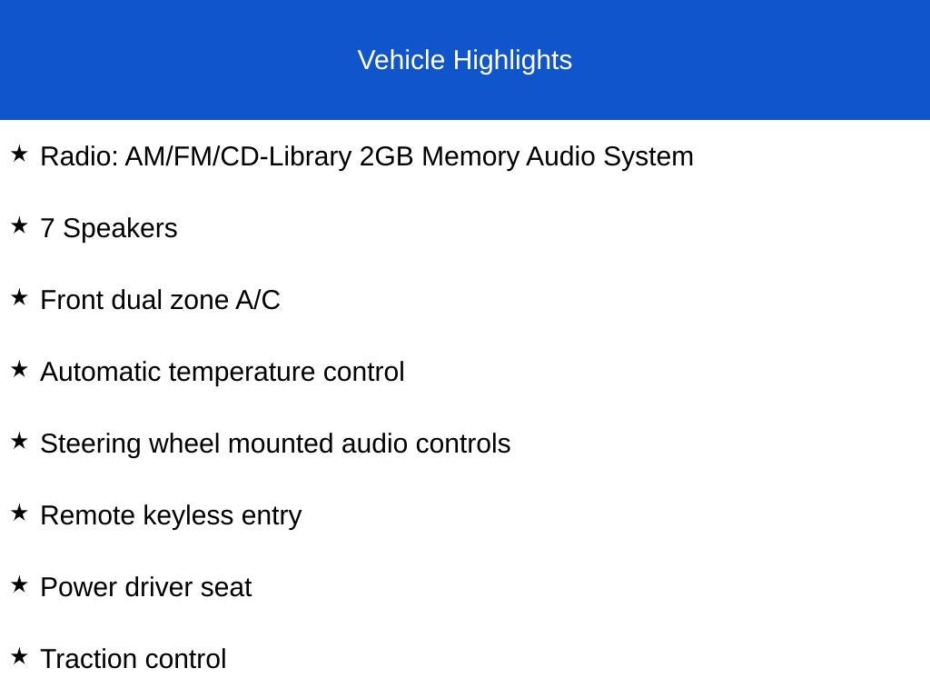 - 229-watt AM/FM/CD audio system -inc: MP3/WMA/AAC playback, 2-GB library memory, aux input jack, USB audio interface, radio data system, (7) speakers w/subwoofer