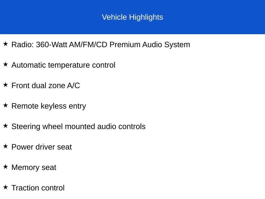 - Leather-trimmed heated front bucket seats -inc: 10-way pwr driver seat, driver pwr lumbar, active head restraints, 4-way pwr front passenger seat, 2-position driver-side memory