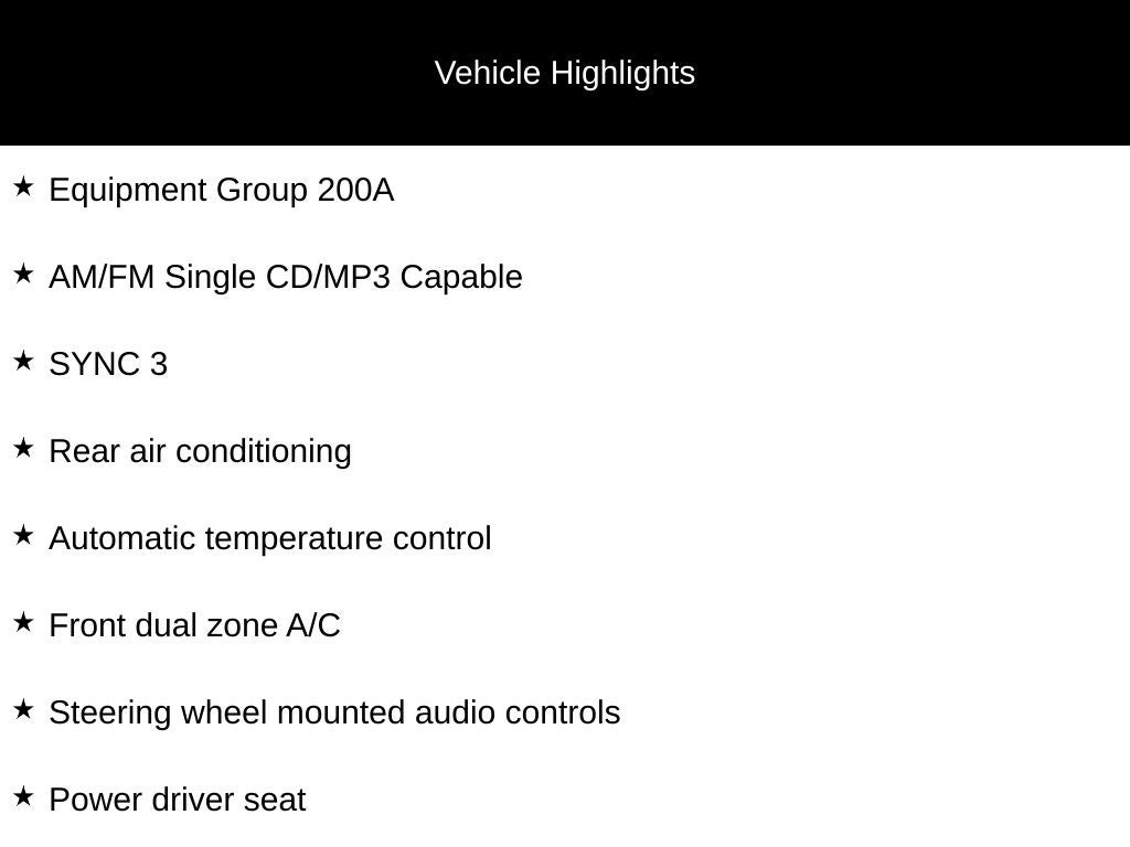 - SYNC 3 -inc: enhanced voice recognition communications and entertainment system, 8" LCD touch-screen in center stack w/swiping and pinch-to-zoom capabilities, AppLink, 911 Assist and 2 smart-charging USB ports