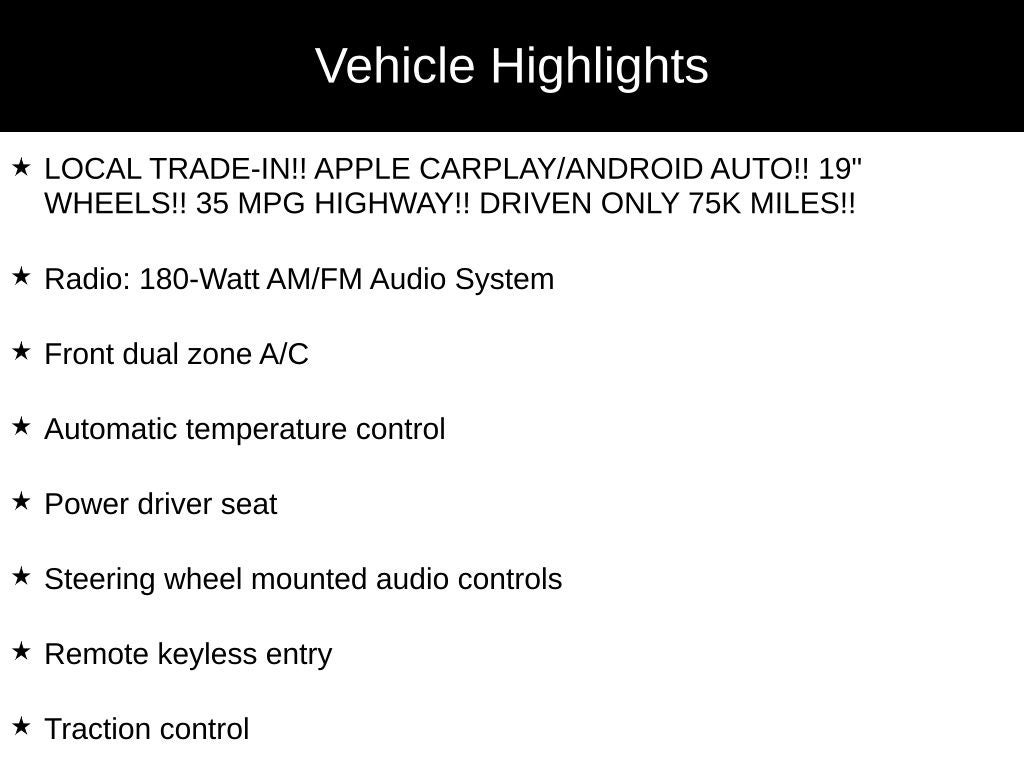 - LOCAL TRADE-IN!! APPLE CARPLAY/ANDROID AUTO!! 19" WHEELS!! 35 MPG HIGHWAY!! DRIVEN ONLY 75K MILES!!