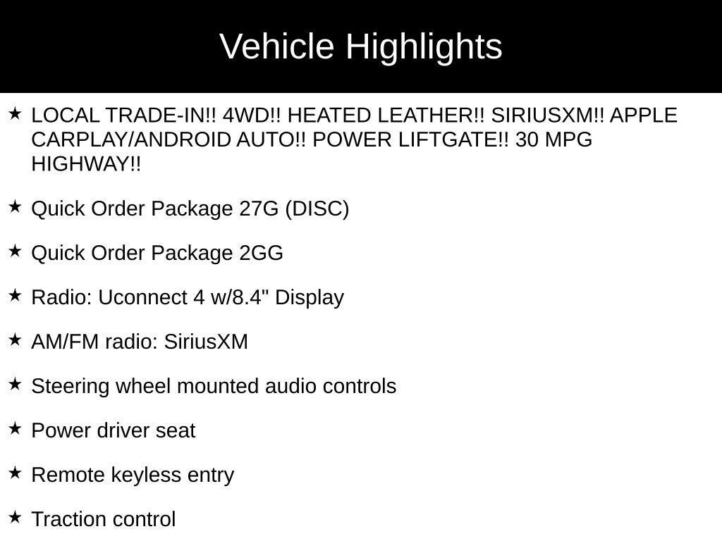 - LOCAL TRADE-IN!! 4WD!! HEATED LEATHER!! SIRIUSXM!! APPLE CARPLAY/ANDROID AUTO!! POWER LIFTGATE!! 30 MPG HIGHWAY!!