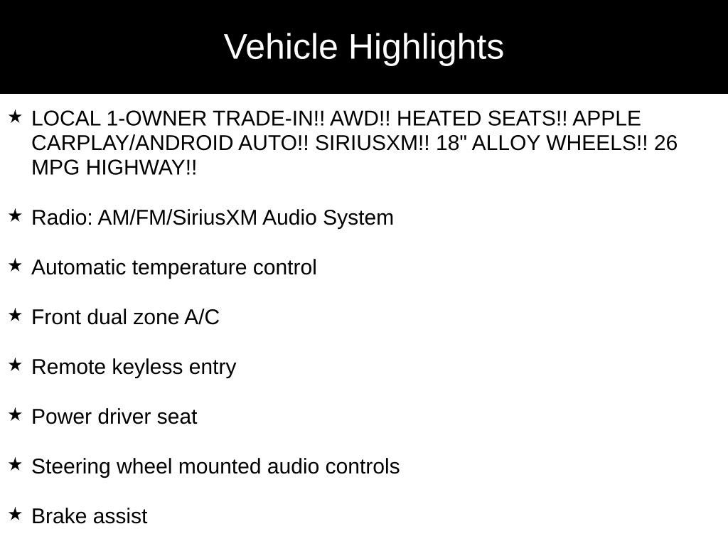 - LOCAL 1-OWNER TRADE-IN!! AWD!! HEATED SEATS!! APPLE CARPLAY/ANDROID AUTO!! SIRIUSXM!! 18" ALLOY WHEELS!! 26 MPG HIGHWAY!!