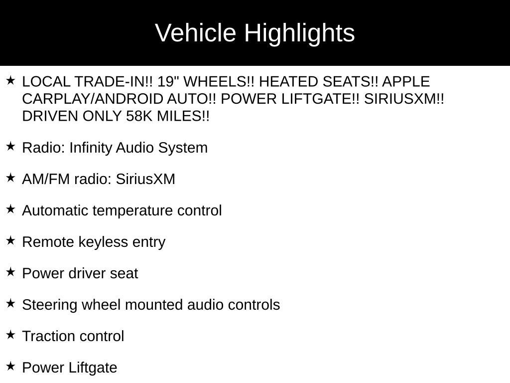 - LOCAL TRADE-IN!! 19" WHEELS!! HEATED SEATS!! APPLE CARPLAY/ANDROID AUTO!! POWER LIFTGATE!! SIRIUSXM!! DRIVEN ONLY 58K MILES!!