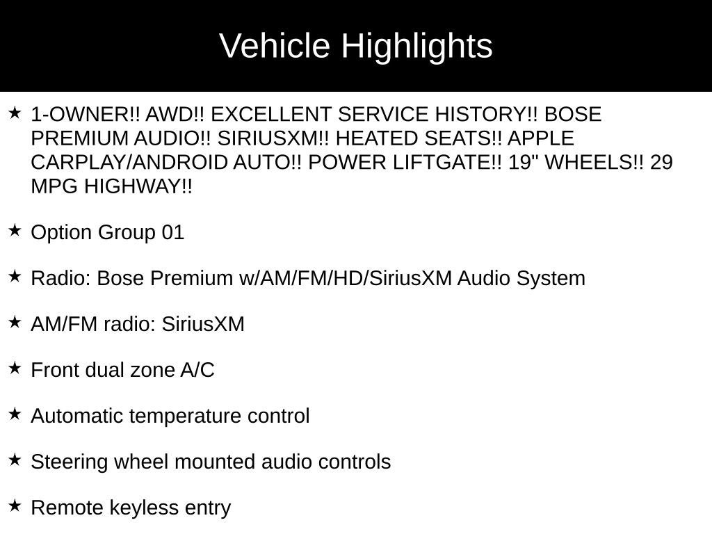- 1-OWNER!! AWD!! EXCELLENT SERVICE HISTORY!! BOSE PREMIUM AUDIO!! SIRIUSXM!! HEATED SEATS!! APPLE CARPLAY/ANDROID AUTO!! POWER LIFTGATE!! 19" WHEELS!! 29 MPG HIGHWAY!!