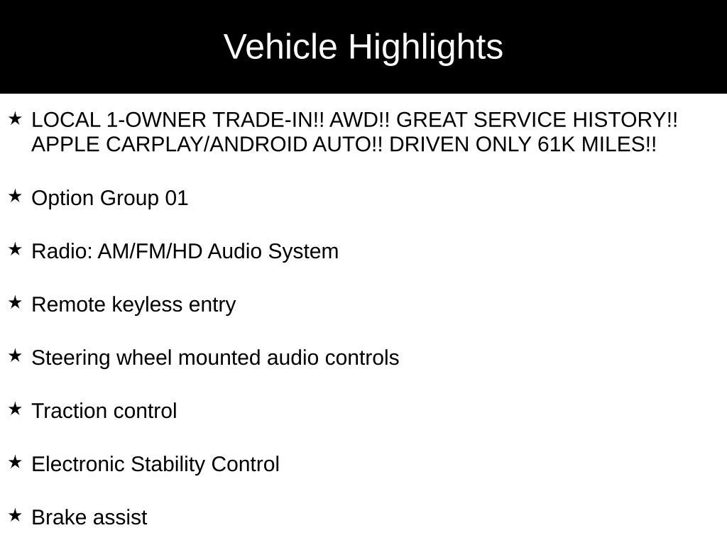 - LOCAL 1-OWNER TRADE-IN!! AWD!! GREAT SERVICE HISTORY!! APPLE CARPLAY/ANDROID AUTO!! DRIVEN ONLY 61K MILES!!