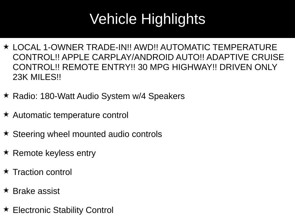 - LOCAL 1-OWNER TRADE-IN!! AWD!! AUTOMATIC TEMPERATURE CONTROL!! APPLE CARPLAY/ANDROID AUTO!! ADAPTIVE CRUISE CONTROL!! REMOTE ENTRY!! 30 MPG HIGHWAY!! DRIVEN ONLY 23K MILES!!