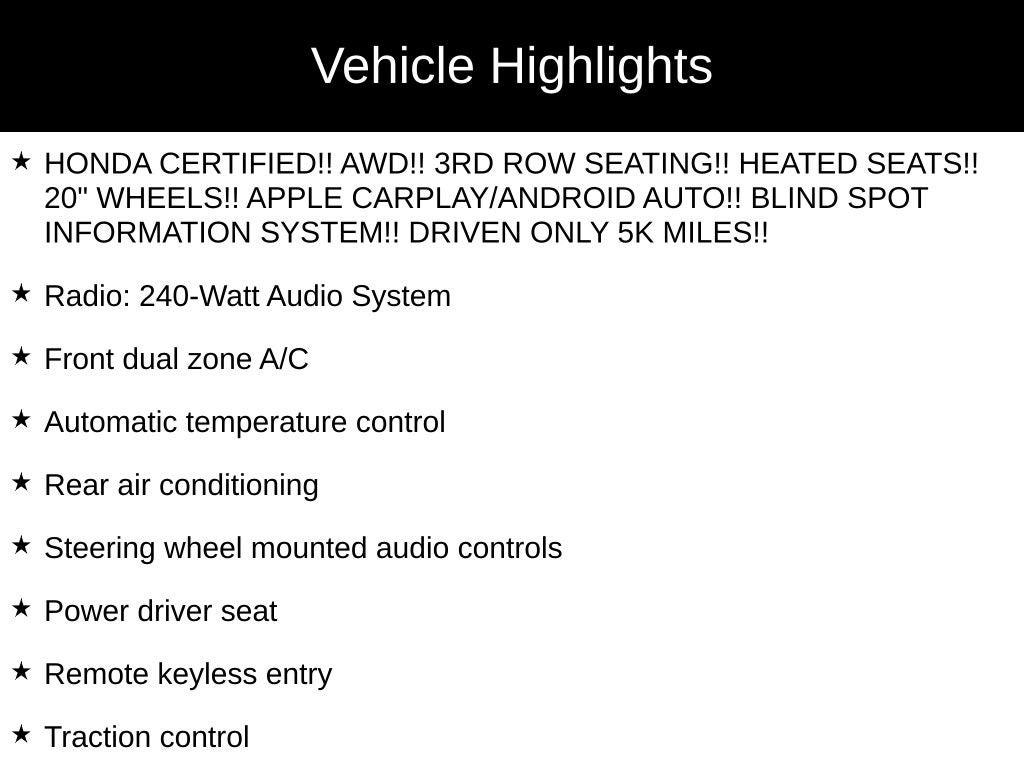 - Honda CERTIFIED!! AWD!! 3RD ROW SEATING!! HEATED SEATS!! 20" WHEELS!! APPLE CARPLAY/ANDROID AUTO!! BLIND SPOT INFORMATION SYSTEM!! DRIVEN ONLY 5K MILES!!